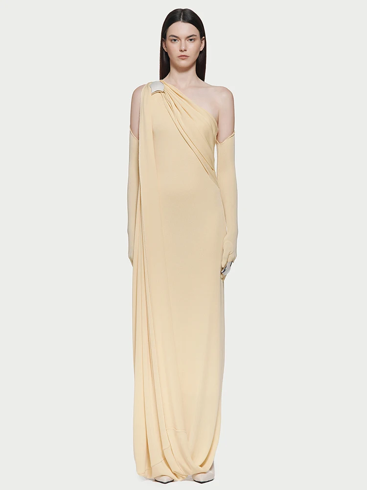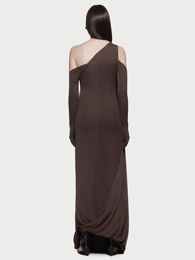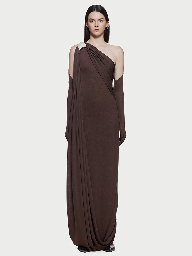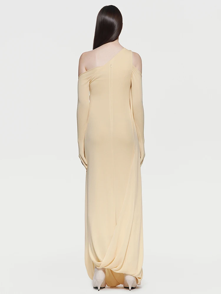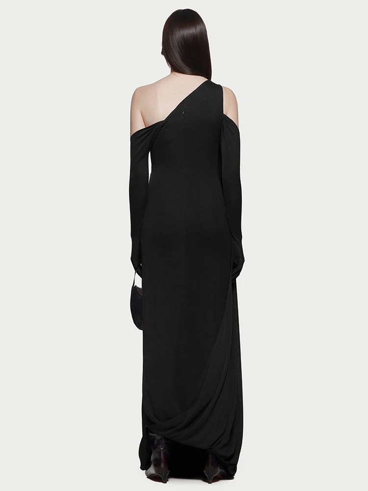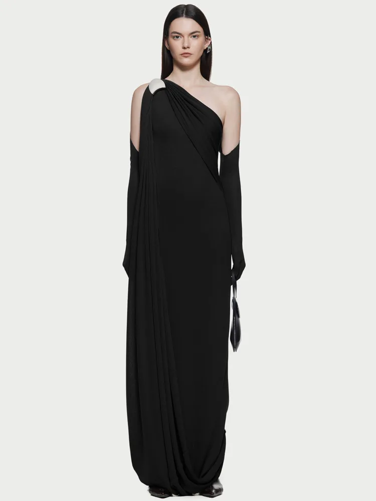 Crafted with a unique diagonal collar and an asymmetrical hem, this dress is designed not just to fit but to flatter, sculpting your silhouette in a cascade of refined pleats. The choice of materials speaks to a blend of comfort and durability, with polyester ensuring a sleek finish and cotton offering breathable elegance, all evening long.