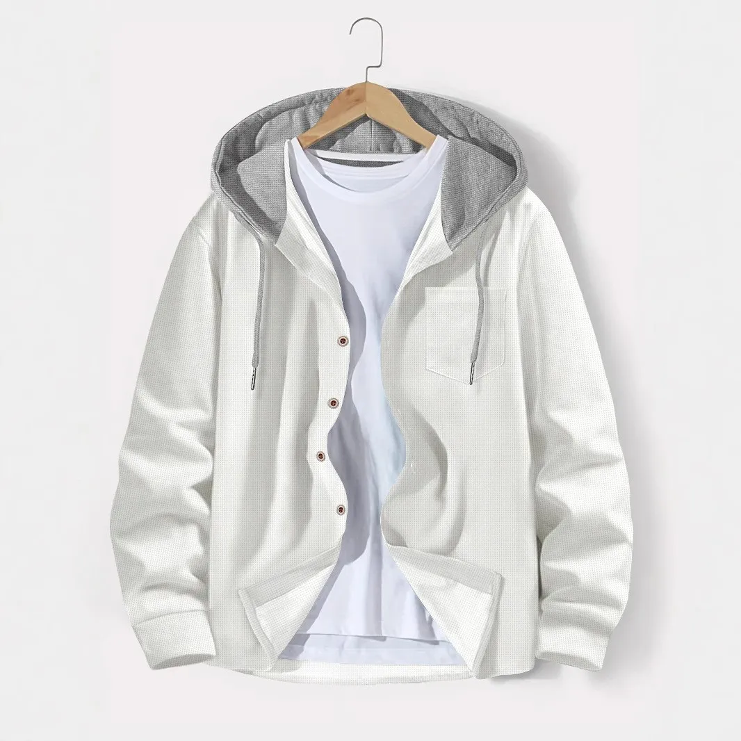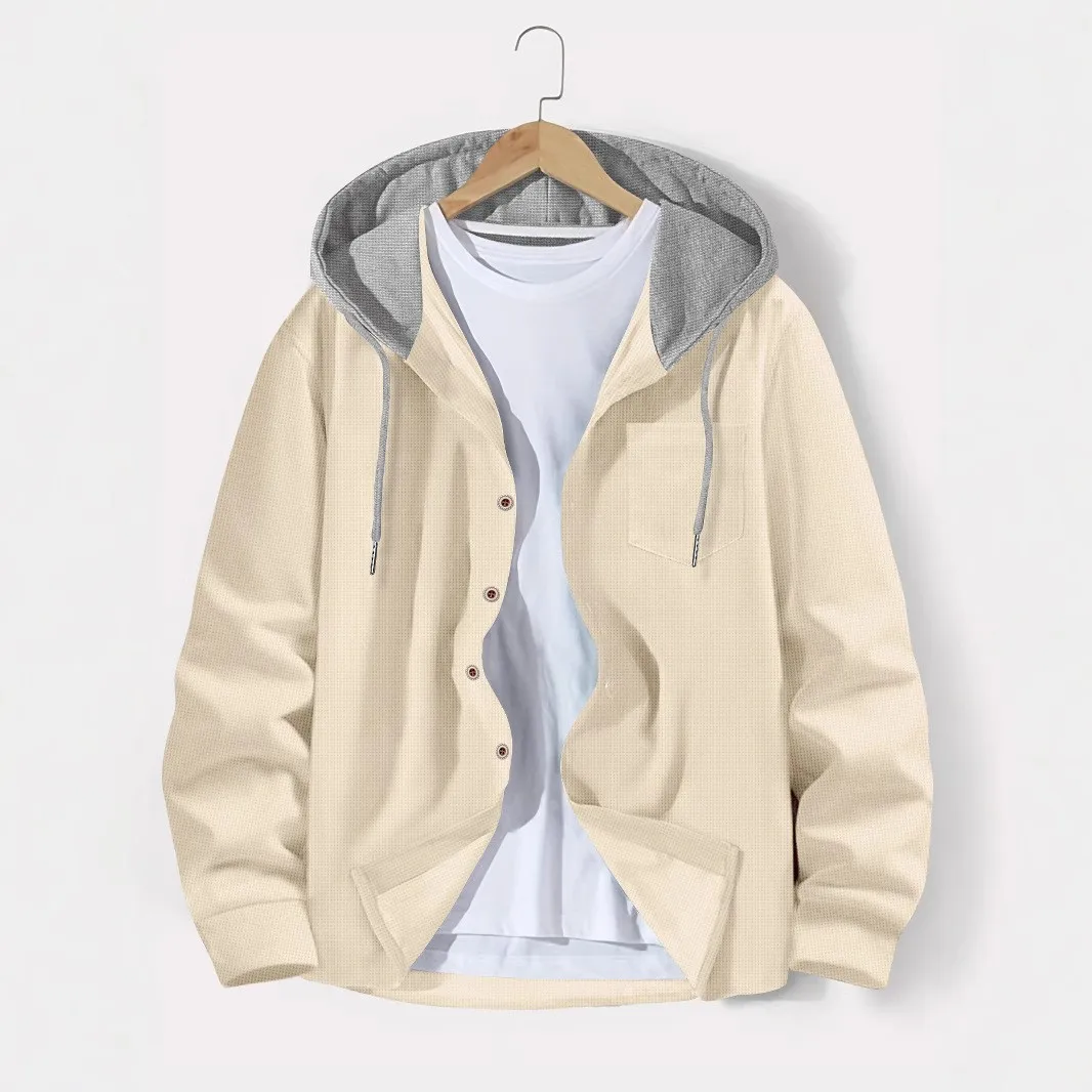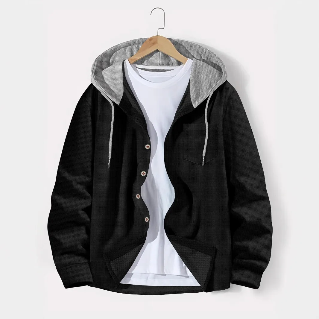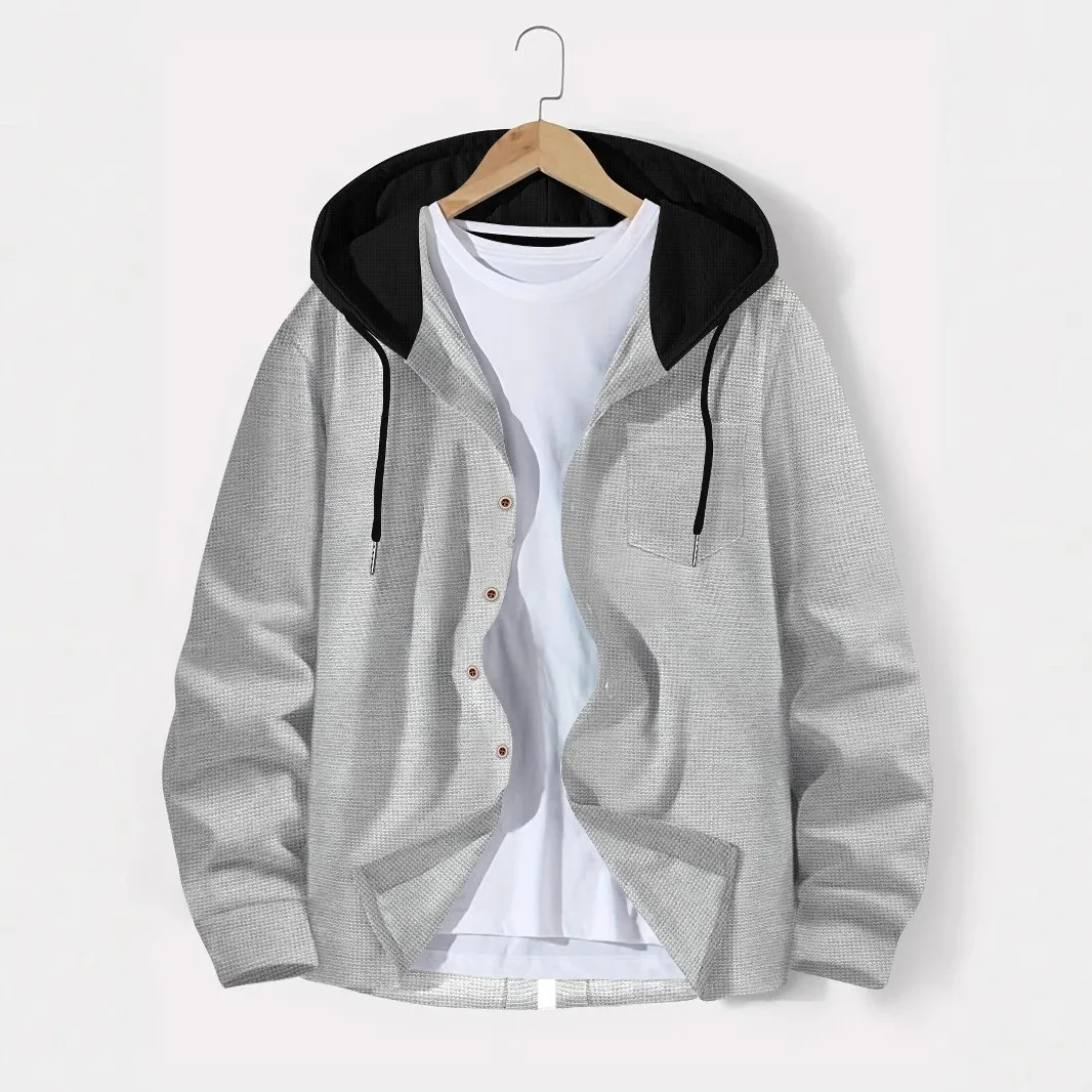 Constructed with a luxuriously tactile polyester that mimics the feel of a lighter waffle knit, this cardigan offers both warmth and breathability. Its thoughtful design is perfect for transitional weather, balancing practicality with effortless style. The single-breasted closure and integrated hood provide versatility and protection against unpredictable autumn breezes, making it a staple in the modern man's wardrobe.