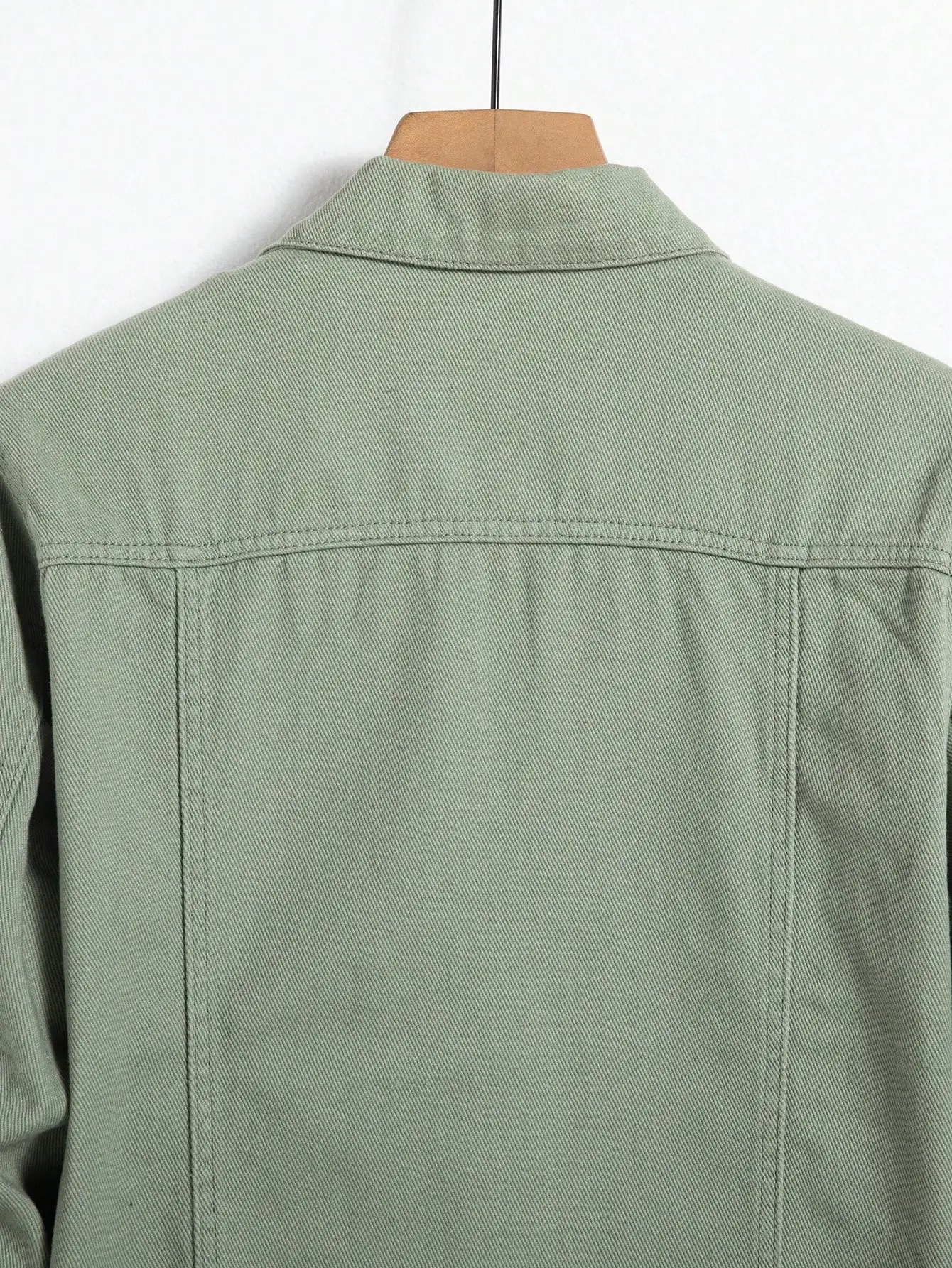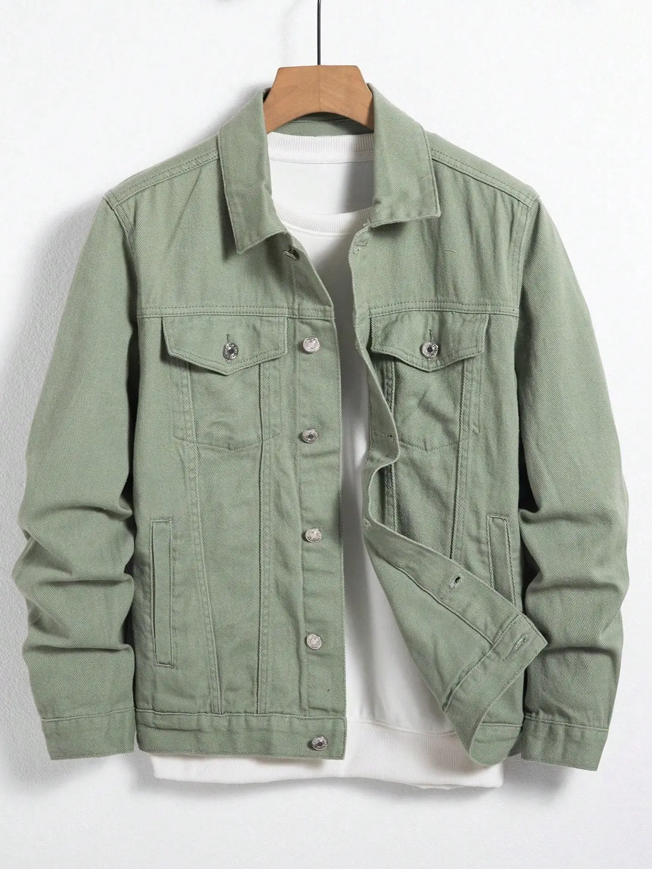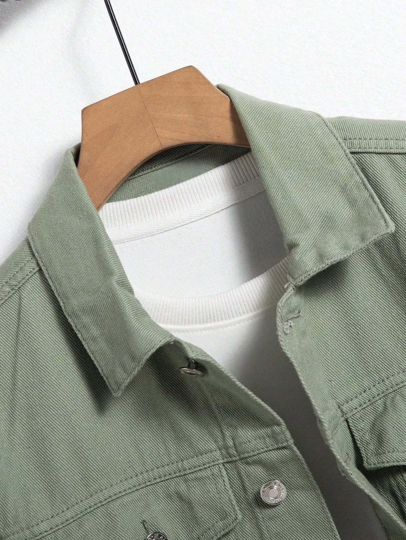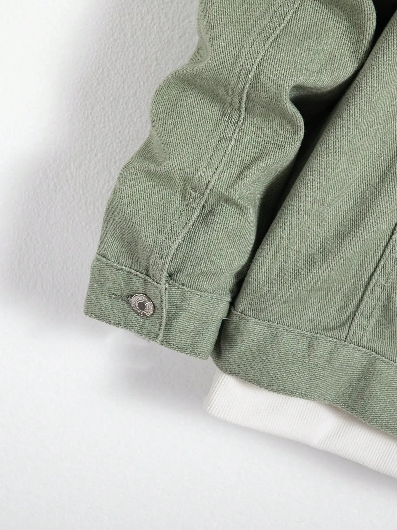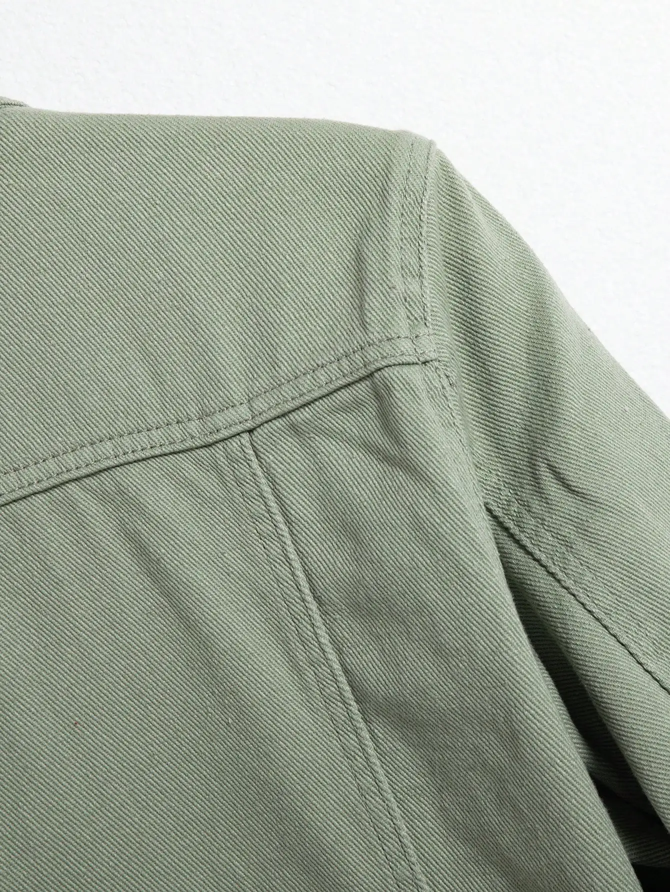 With its vibrant yet earthy green hue, this jacket brings a fresh twist to the classic denim design. The meticulously crafted turn-down collar and symmetrical chest pockets provide a polished look while maintaining a casual vibe. It's the kind of piece that blends into your lifestyle, enhancing your wardrobe without demanding attention, making you feel undeniably put-together whether you're heading out for coffee or catching up with friends on a weekend getaway.